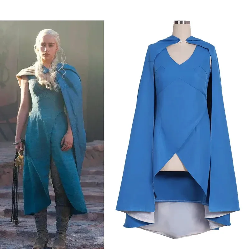 ❤❤TV Series Daenerys Cosplay Targaryen Costume Blue Dress with Cape for Women Halloween Party Stage Performance Suit❤