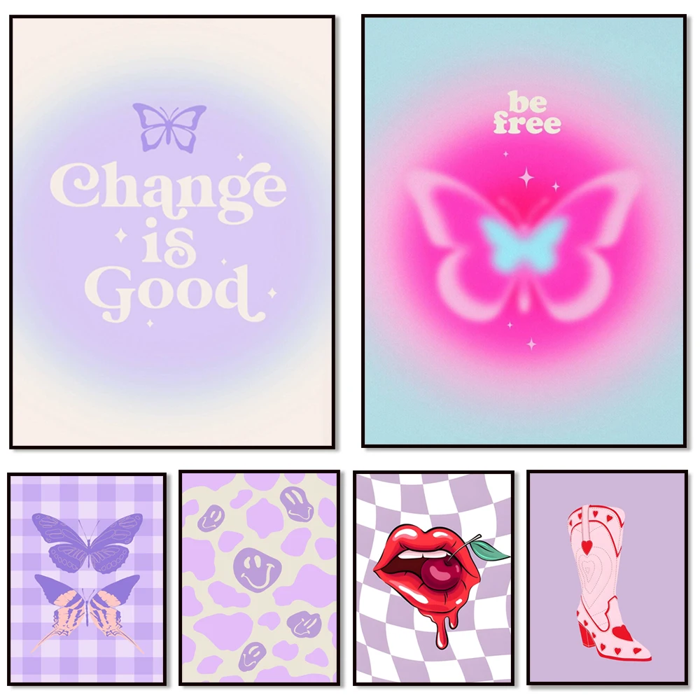 70's fashion gradient, butterfly, plaid butterfly, purple heart Danish pastel Y2K poster, purple aesthetic room decoration,