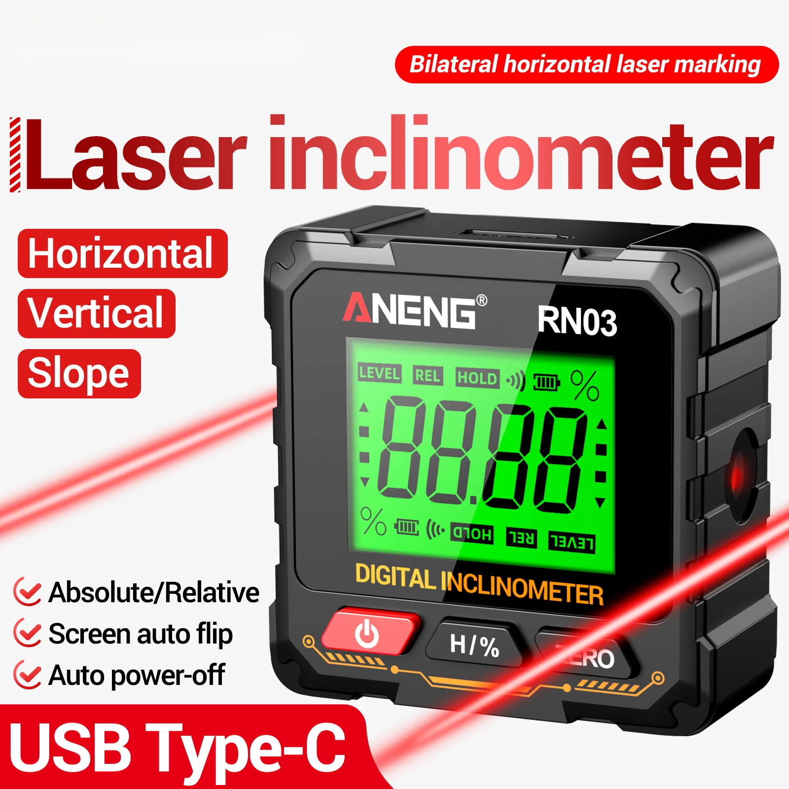 Magnetic Digital Angle Finder ANENG RN03 Laser Inclinometer Rechargeable USB Protractor Level Angle Ruler Angle Measurement