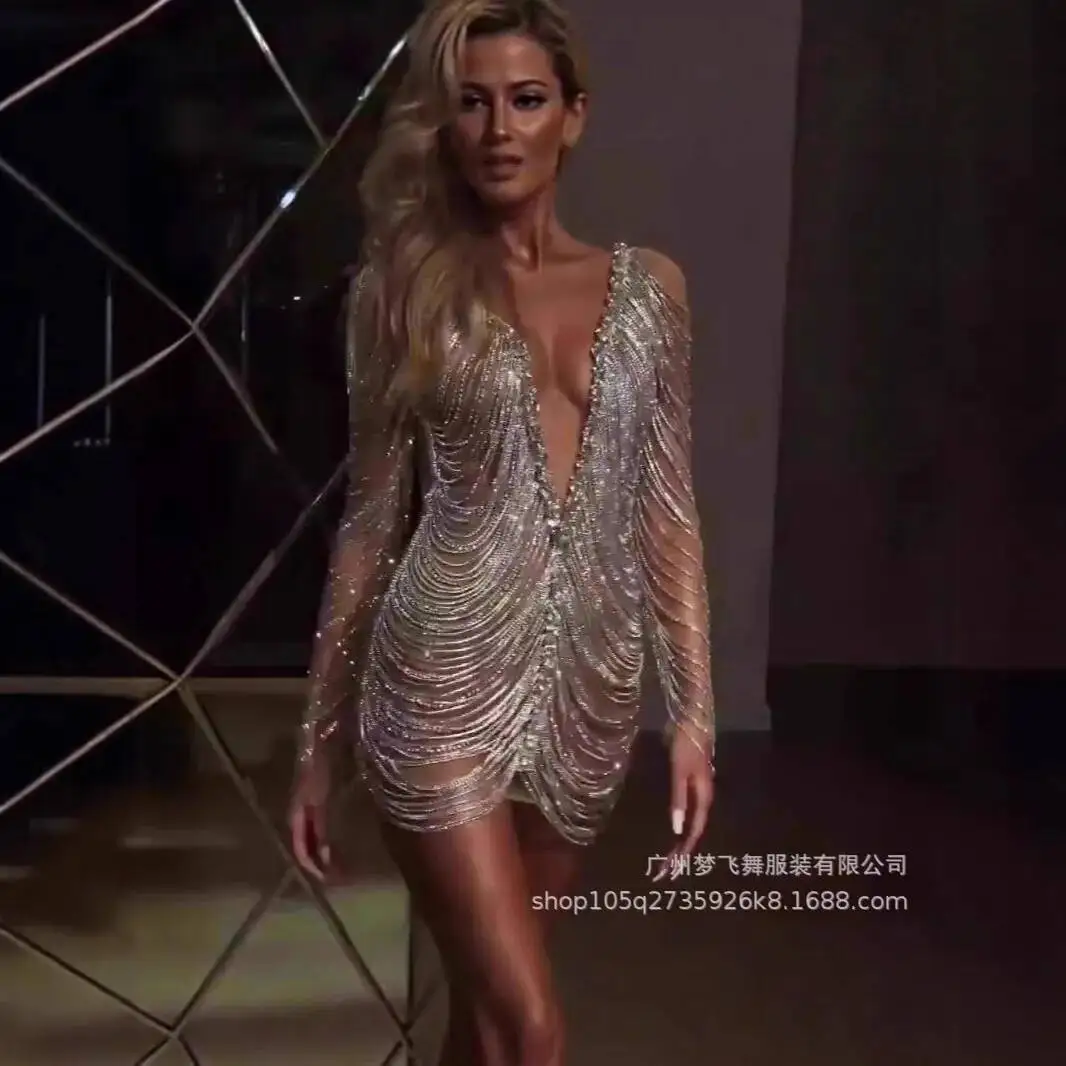 Rhinestone Tassel Sexy Deep V Dress Bar DS Performance Costume Nightclub DJ Performance Costume