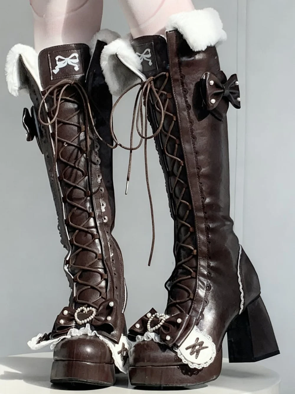 Chocolate Brown Lolita Knee-High Boots Faux Fur Lining Lace-Up Front Bow & Pearl Accents Ruffled Trim Sweet Cute Lolita Style