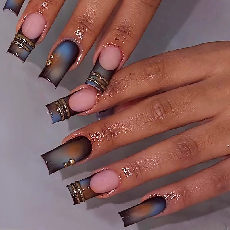 10Pcs Acrylic Press on Nails Brown Nails Gradient Cat's Eye Fake Nails Includes 1 Sheet Adhesive Tabs & 1 Pc Mini File