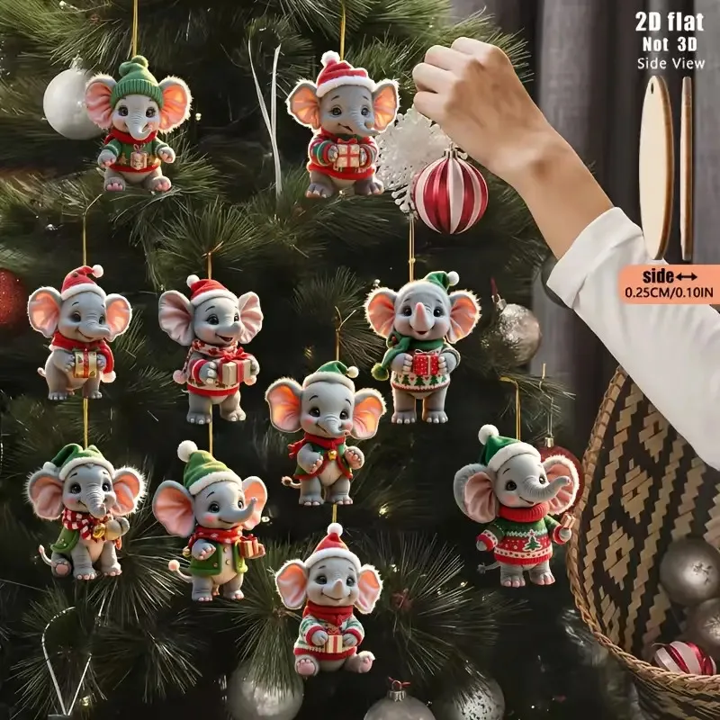 10pcs Cute Christmas Elephant 2D Wooden Pendant Elephant Wearing Clothes Hat for Christmas New Year Valentine's Day Decorations