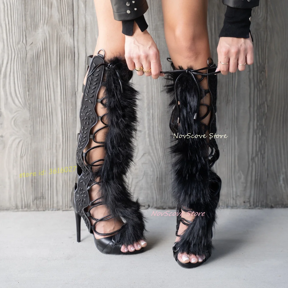 Open Toe Fur Knee High Boots Cutouts Gladiator Stiletto High Heels Lace Up Sandals Booties Black Embroidered Party Long Boot