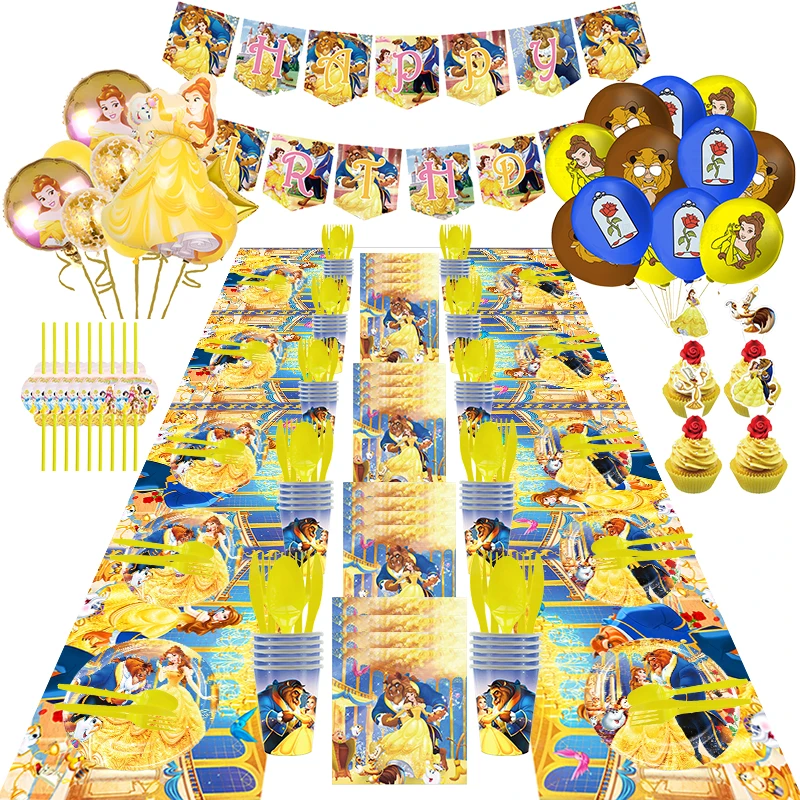 Belle Princess Beauty And Beast Theme Birthday Party Supplies Disposable Tableware Plates Balloons Backdrop Wedding Home Decor