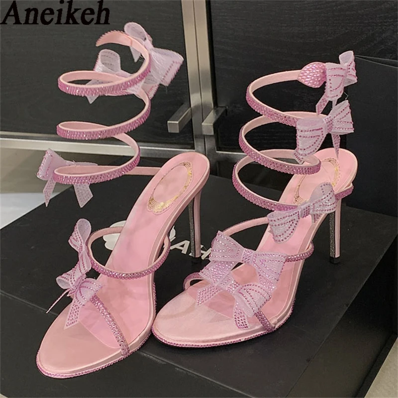 Aneikeh Elegant Pink Wedding Shoes CRYSTAL Bow High Heels Sandals Woman Summer Ankle Strap Thin High Heels Open Toed Party Shoes