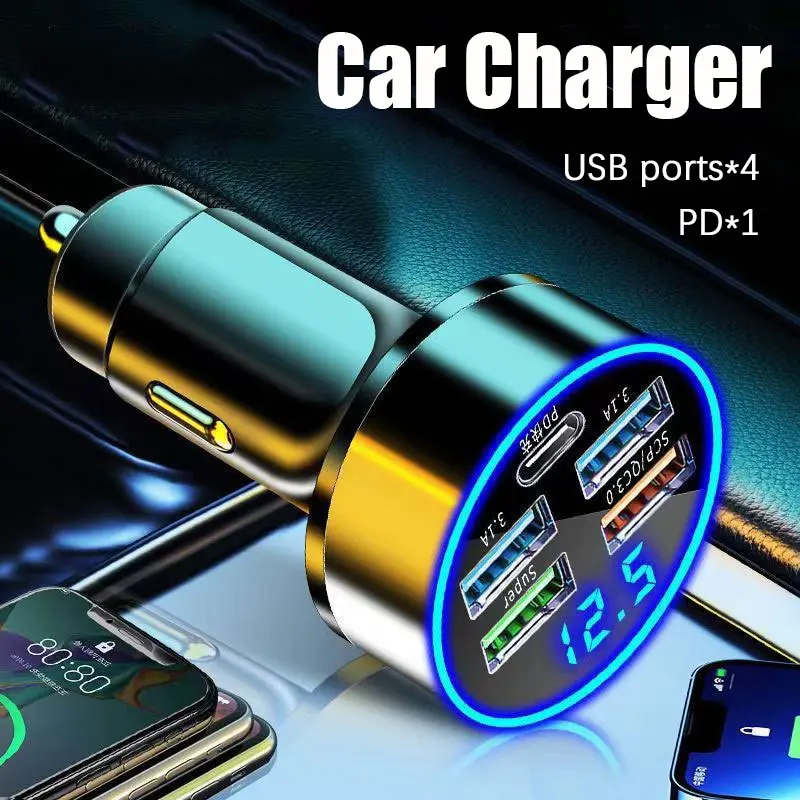 USB C Car Charger, 5-Port 250W Fast Charging Car Power Adapter PD20W Cigarette Lighter USB Charger Adapter For Apple and Android