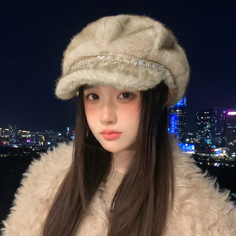 Vintage Plush Beret Stylish Faux Fur Beret Women'S Beret Hat Warm Colorful Chain Hat For Ladies Gift Autumn Winter Fashion