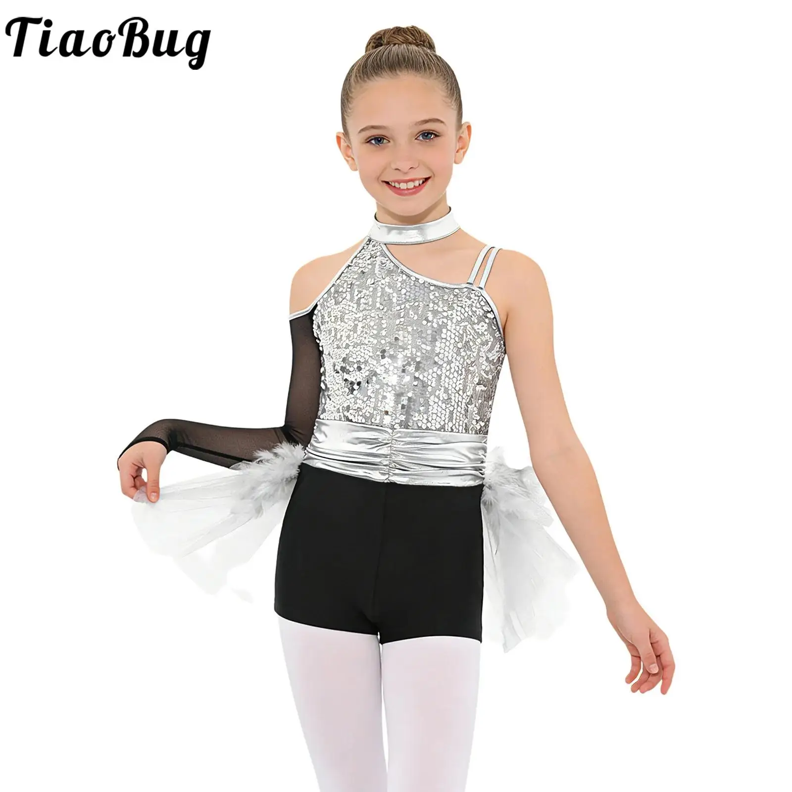 Kids Girls Latin Jazz Dance Jumpsuit One Shoulder Sparkly Sequins Bodice Feather Tulle Tutu Skirted Leotard Stage Competition