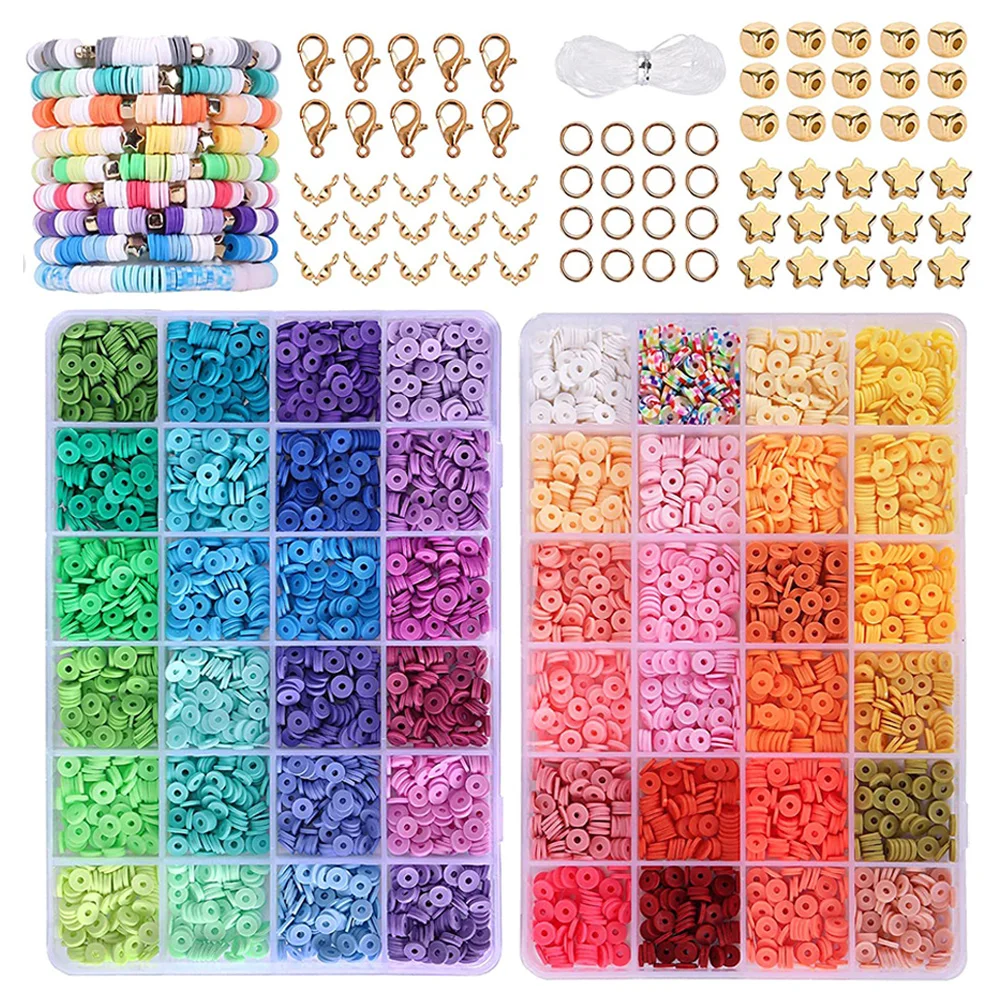 6000 Pcs 24 Colors Flat Round Polymer Clay Beads 6mm Spacer with Pendant Charms Kit and Elastic Strings for Jewelry Making Kit