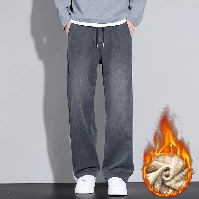 Winter Thick Warm Sweatpants Men Fleece Liner Drawstring Straight Loose Track Pants Male Casual Retro wash Thermal street Wide