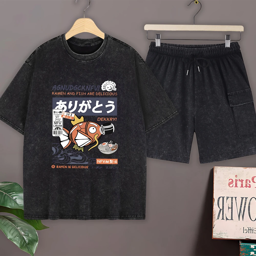 Harajuku Fish Eating Noodles Cotton Washed T-Shirts Set Mens Summer Oversize T Shirt Pants O-Neck Short Sleeve Tops Cargo Shorts