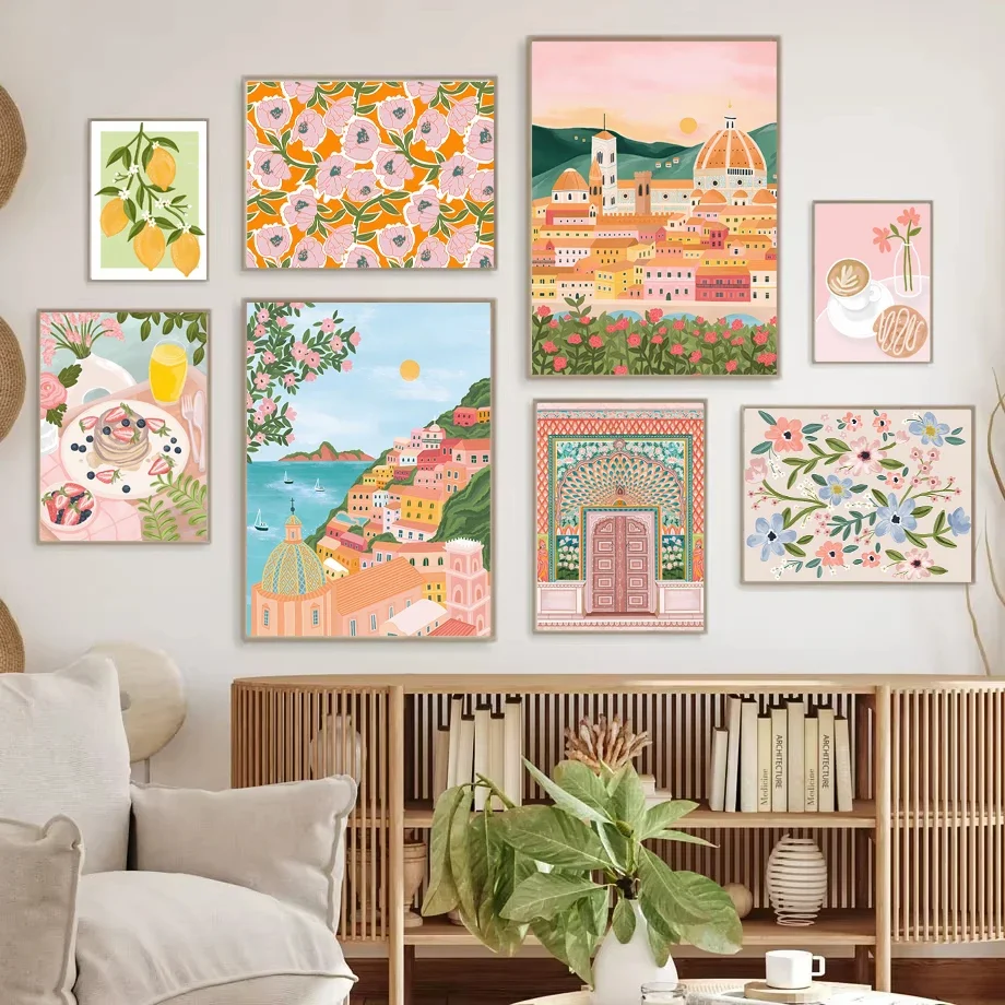 Santorini Lemon Coffee Flowers Abstract Landscape Posters and Prints Wall Art Canvas Painting Pictures For Living Room Home Deco