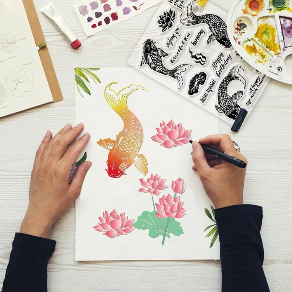 Koi Fish Clear Stamps Lotus Flower Lotus Leaf Clear Stamp Seals for Cards Making DIY Scrapbooking Photo Journal Album Decoration