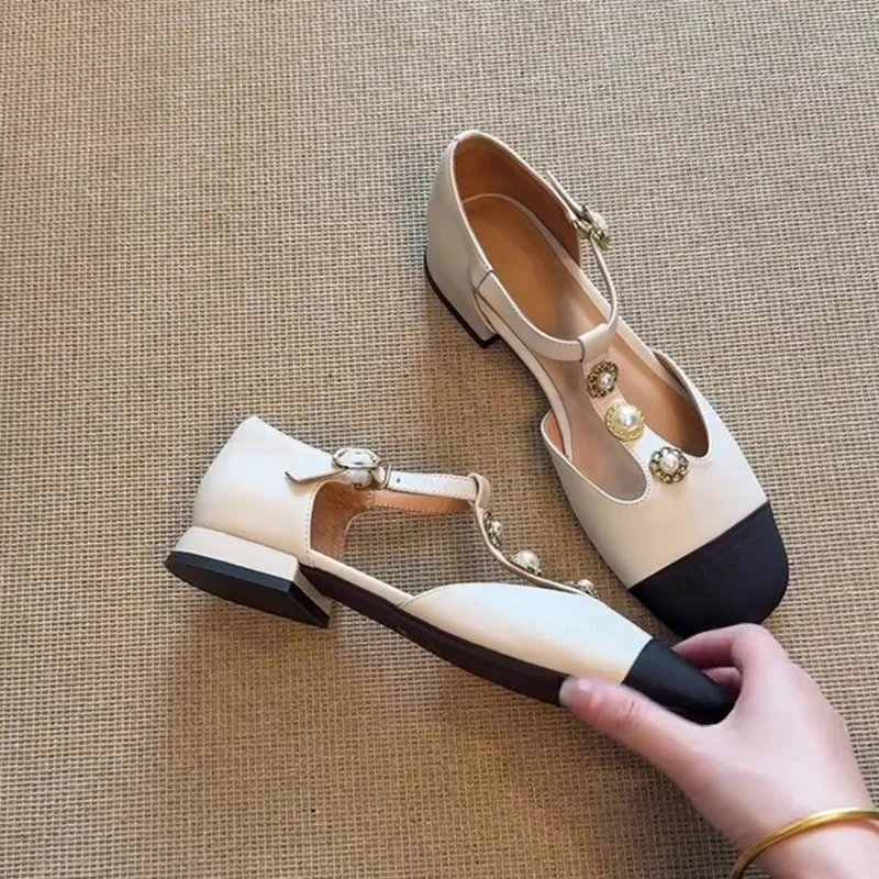 Sandal T-string 2025 New Color Block Niche Sweet French Pearl Low-heeled Single