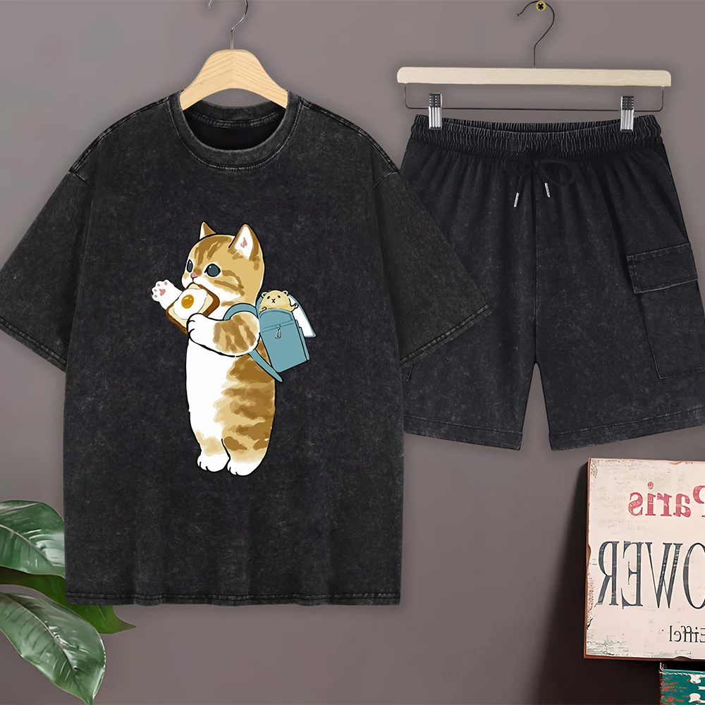 Cute Cat Eating Toast Design Cotton Washed T-Shirt Set Mens Summer Short Sleeve Tops Pants O-Neck Oversized T Shirt Cargo Shorts