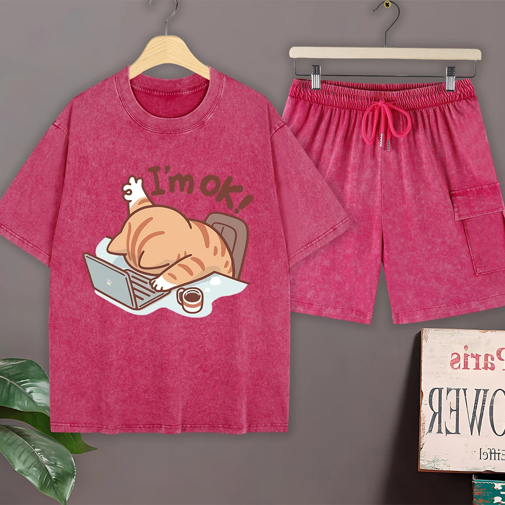 Fun Cat I'M Ok Cotton Washed T-Shirts Set Mens Casual Oversize T Shirt Cargo Shorts O-Neck Short Sleeve Tops Pantssummer Clothes