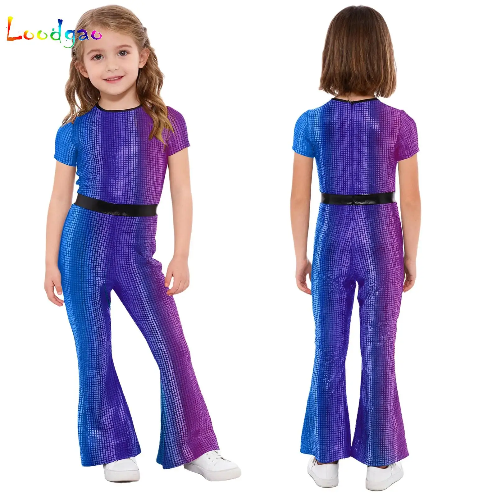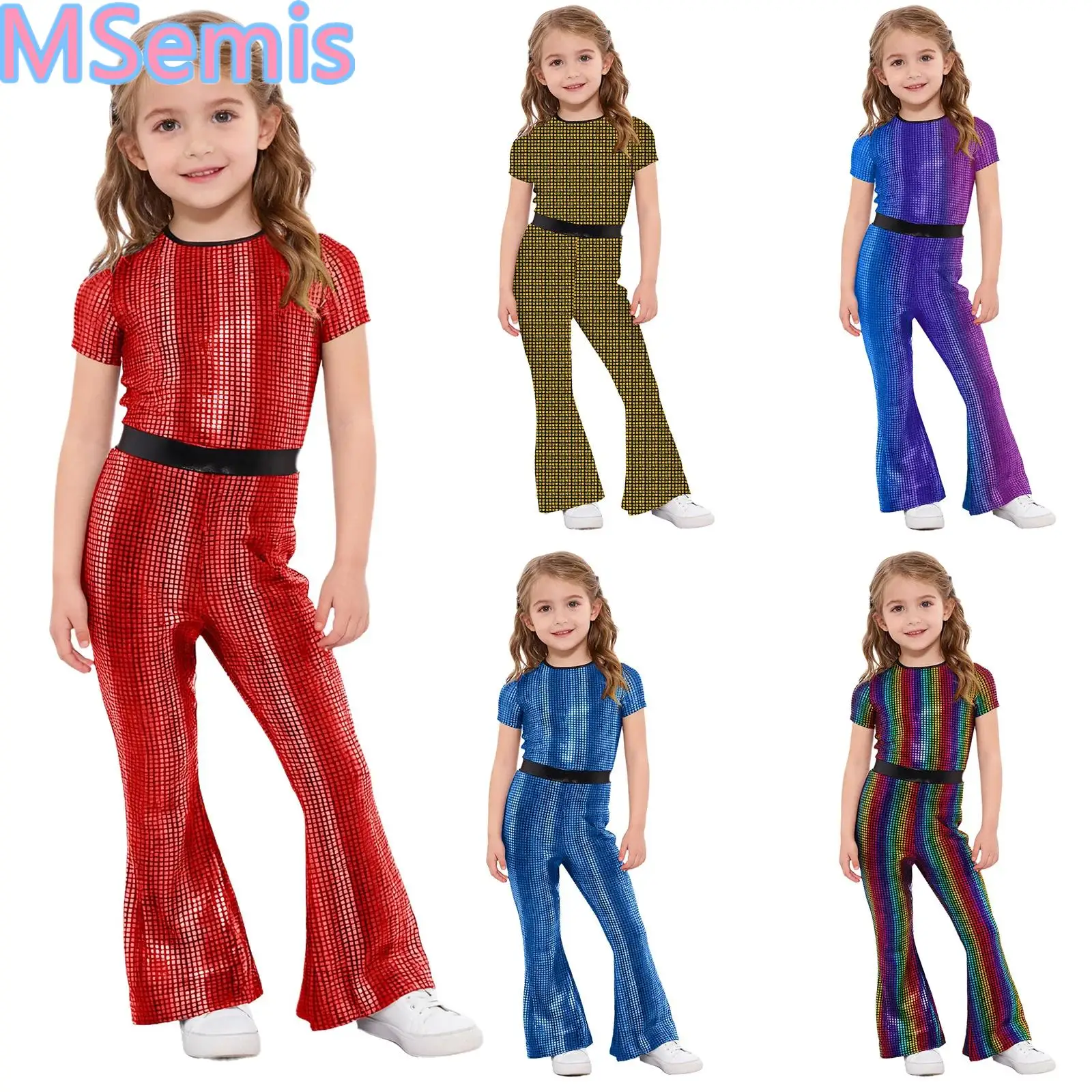 Kids Girls 80s Disco Dance Pants Hippie Pants Elastic Waist Patchwork Bell Bottoms Flared Pants for Ballroom Performance Costume