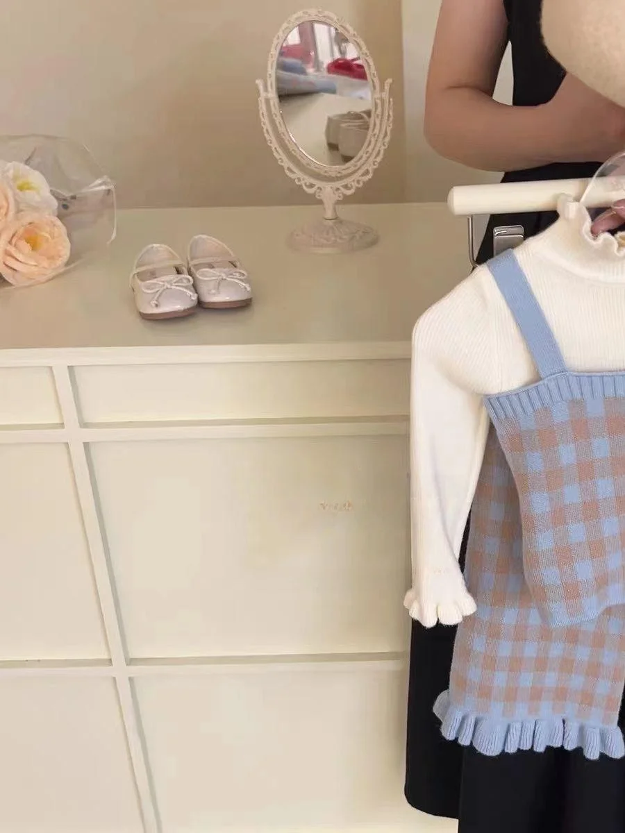 Girls Plaid Knitted Set 2025 Autumn New Fre Sweater Cardigan Flared Pants Strap Tee-piece Children's Faion Outfit