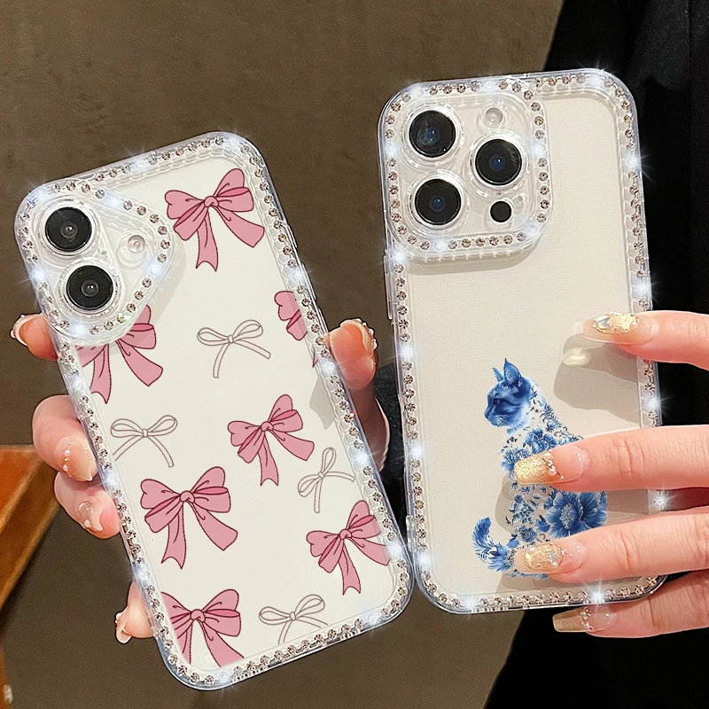 Pink Bowknot Phone Case For iPhone 16 Pro Max Cases for 16 15 14 13 12 Pro Max 11 16e Crystal Diamond Soft TPU Clear Cover Coque