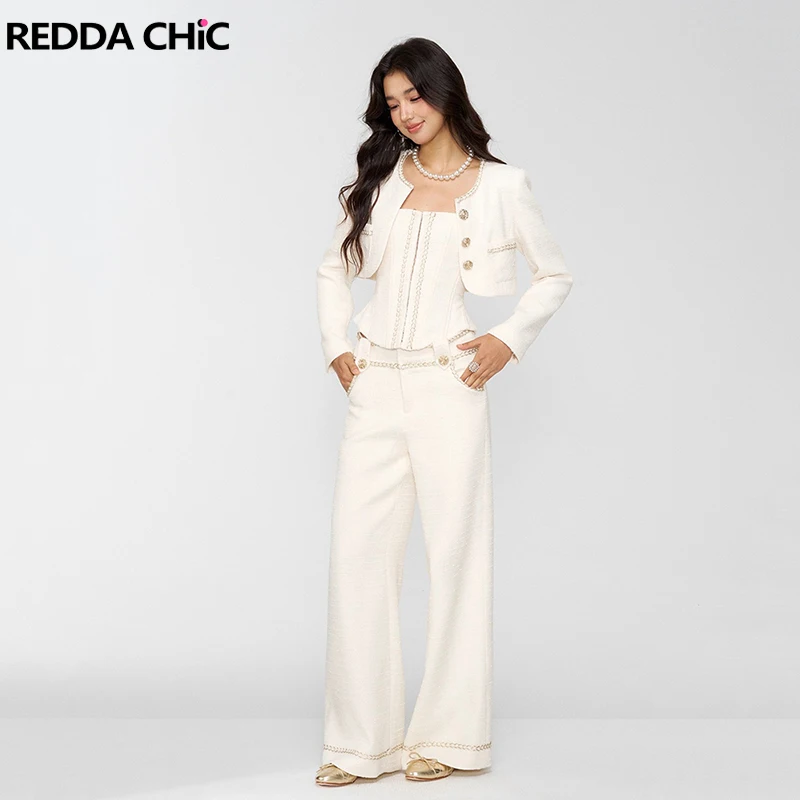 REDDACHiC Dressy Gold Braided Tweed Pant Suits Women Top Cropped Blazer Jacket Wide Leg Trousers Fashion Work 3-piece Outfits