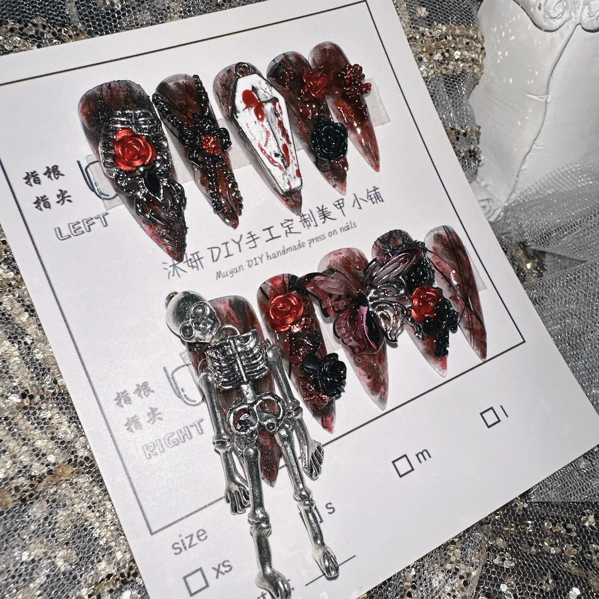 Gothic Blood Red Press On Nails Skeleton Heavy Duty Stiletto Handmade Dark Style Nail Art Set Heavy Duty Stiletto Dark Red Black