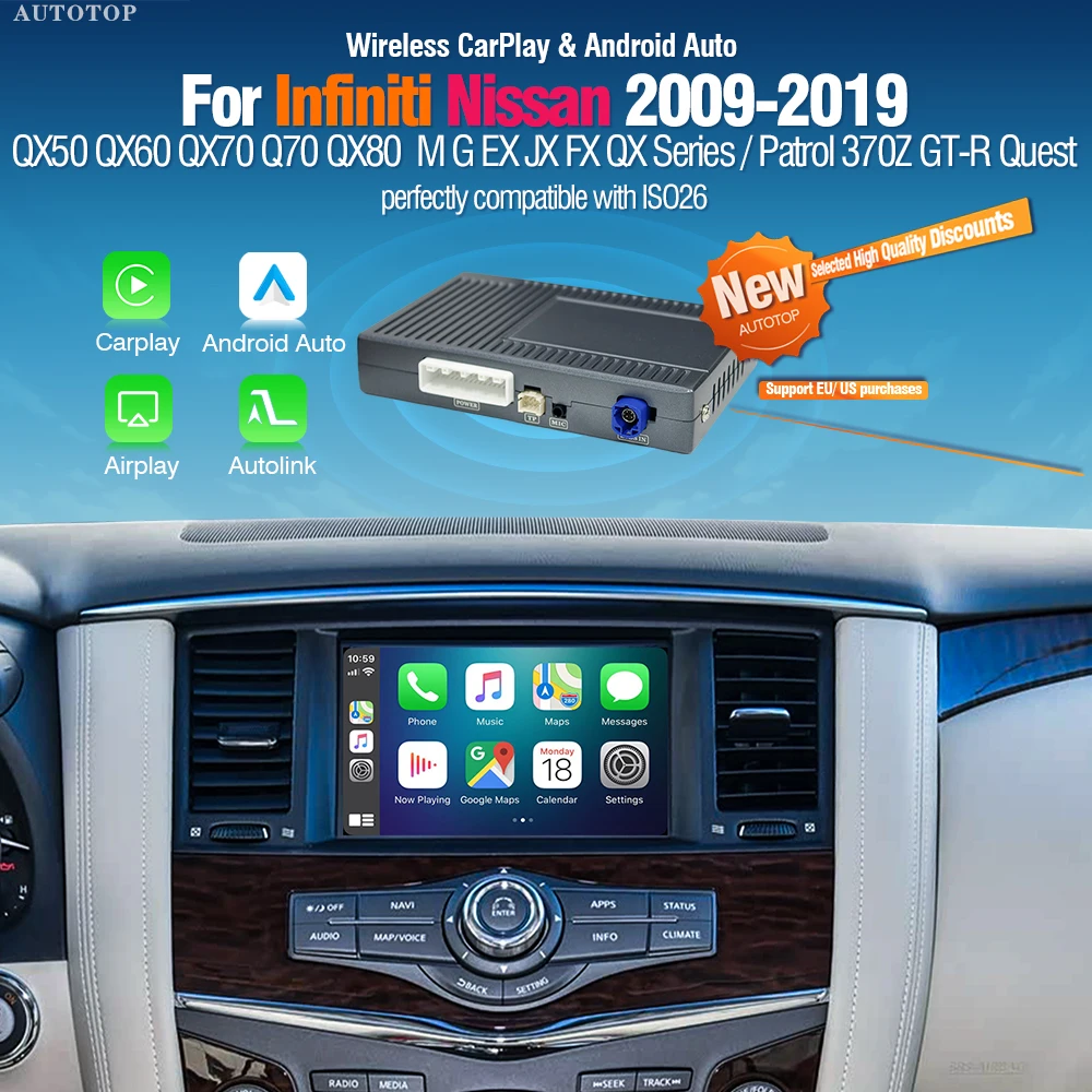 AUTOTOP Wireless CarPlay Android Auto Decorder for Infiniti QX50 QX60 Q60 QX70 Nissan Quest GTR Patrol MirrorLink Aux BT Module