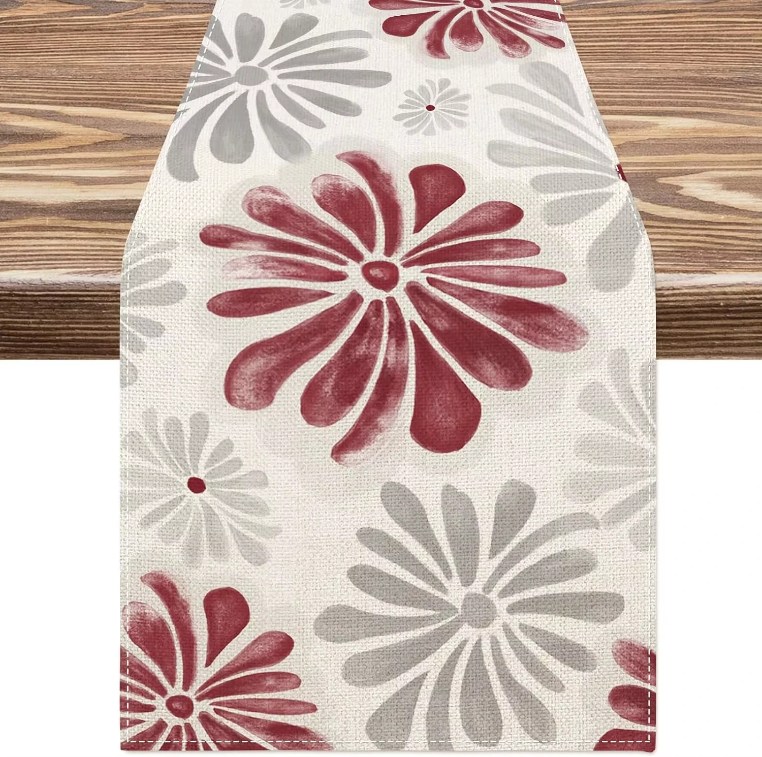 Watercolor Red Grey Flowers Linen Table Runner, Floral Dresser Scarf for Kitchen Dining Table and Home Decor