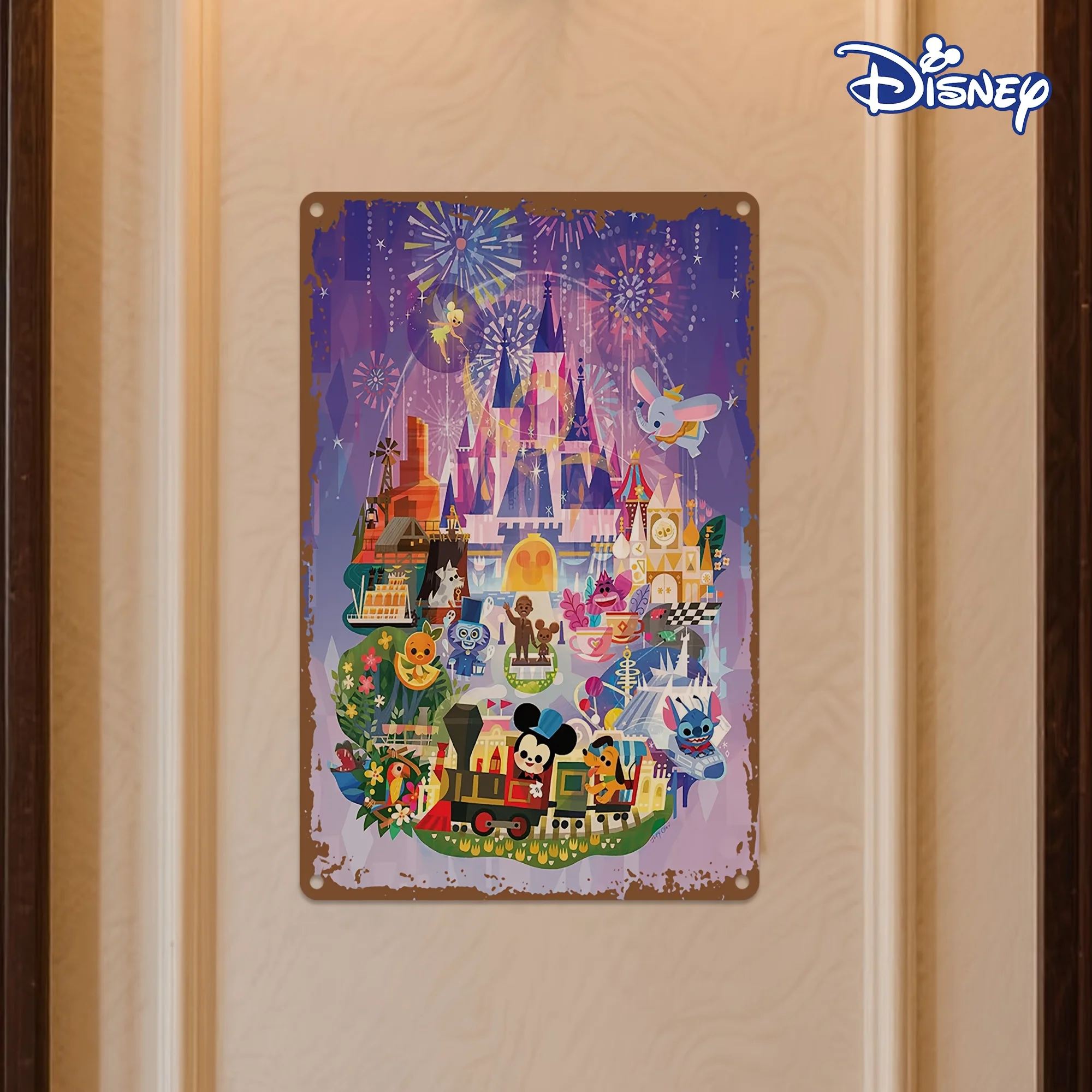 1pc Disney Metal Tin Sign - Colorful Cinderella Castle Art with Mickey, Minnie, Donald & Goofy, Fireworks & Stars Night Sky Desi