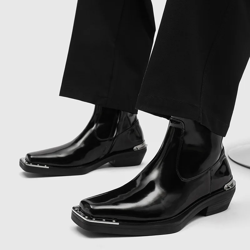 italian brand designer mens fashion punk rock chelsea boots patent leather shoes square toe cowboy boot cool ankle botas hombre