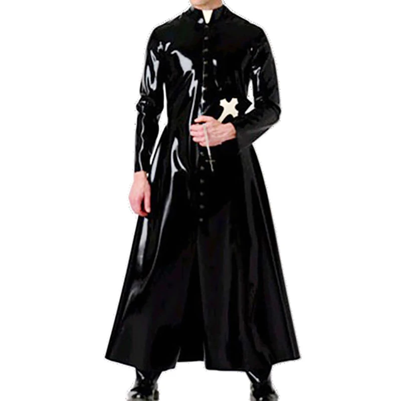 Black Sexy Latex Monastic Clothes Buttons Front Long Rubber Religious Habit Monk Uniform Monacal Blackfriars Robe Coat 154