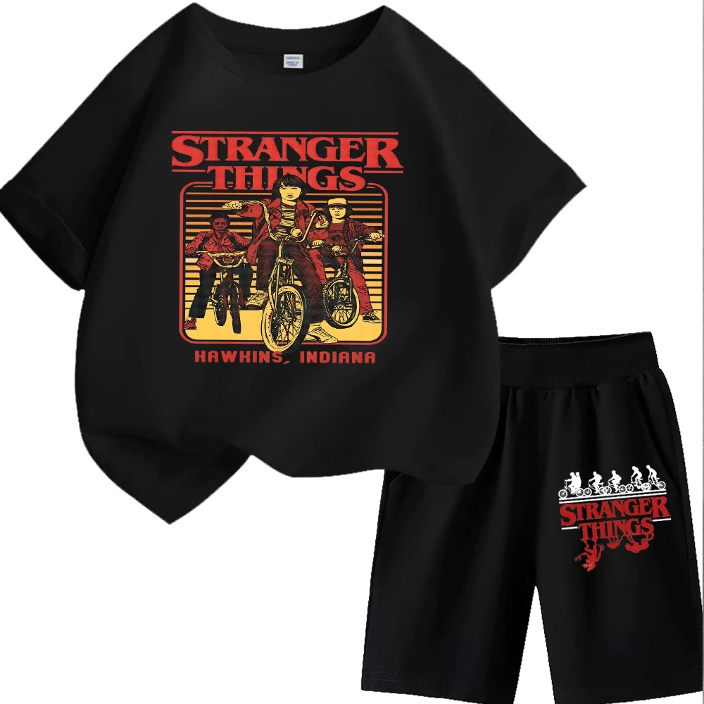 Kids Stranger Things Demogorgon Printed T-shirt Set, Fashionable and Comfortable Men's and Women's Short sleeved T-shirt+Shorts
