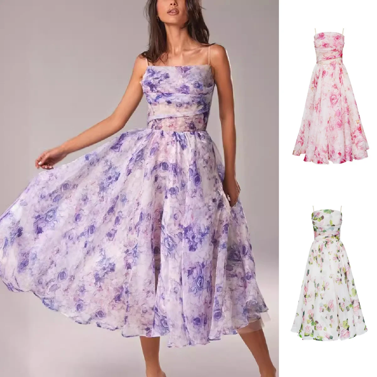 Floral Printed Sleeveless Long Dresses Fashion Sling Boho Backless Gown Women Straps Ruffles Dress 2025 Summer Large Swing Dress