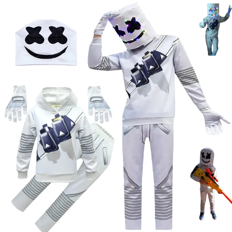 New Halloween Marshmallow DJ Kids Cosplay Costume child Hoodies Pants gloves Set Boys Music LED headwear Christmas Party Gift