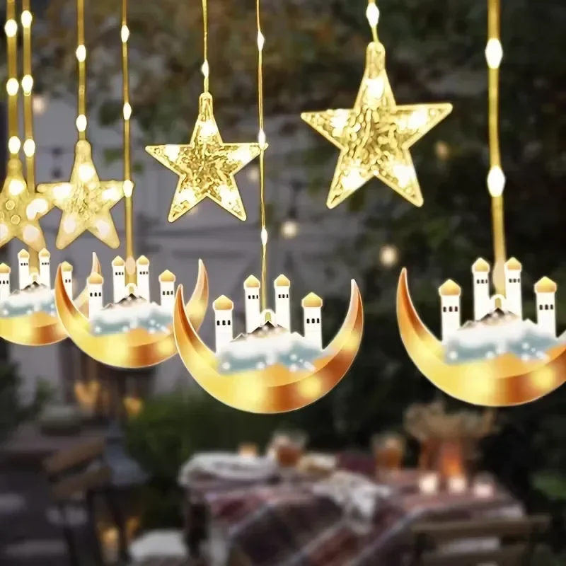 LED Moon and Star Window Curtain Lights USB Powered 8 Lighting Modes with Timer Function Ideal for Ramadan Thanksgiving