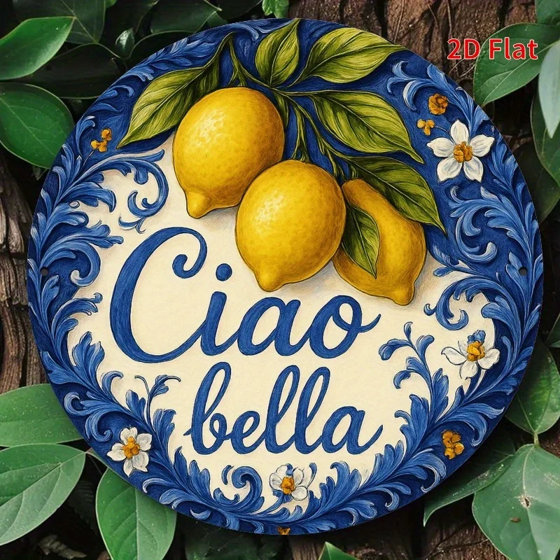 2D Flat, 1pc Metal Sign with Lemon Design & Greeting - "Ciao Bella" in Italian, Floral Border, Ideal for Home, Office, Bedroom,