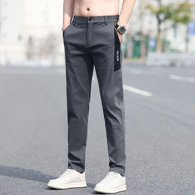 Men's Gray Slim-Fit Casual Pants Contrast Patch Pocket Letter Decor Elastic Waist Daily Office Comfortable Trousers