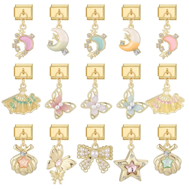 Golden Charm Shell Butterfly Star Moon Cherry Italian Charm Links Fit 9mm Bracelet Stainless Steel DIY Jewelry Making Wholesale