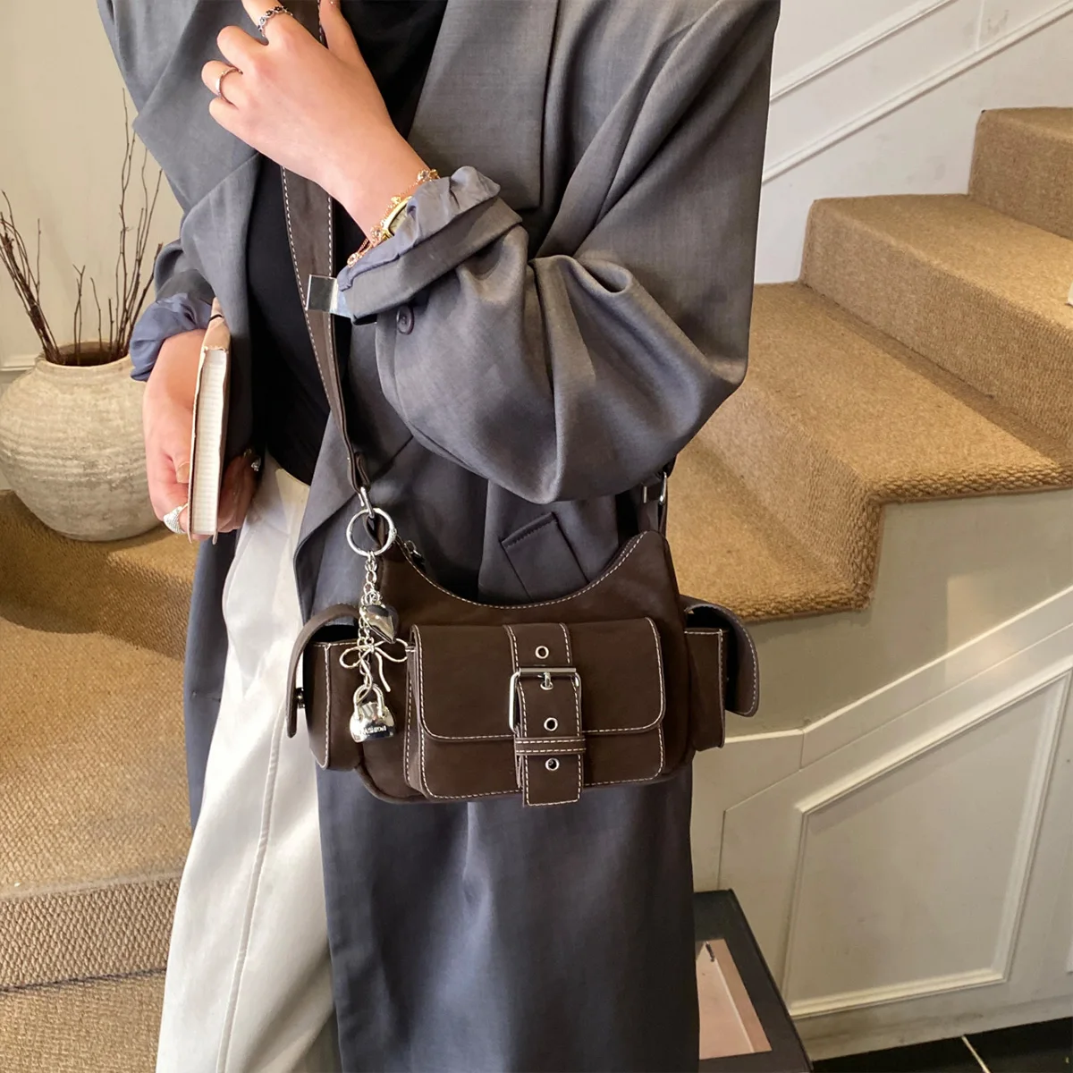 Belt Buckle Lock Charm Vintage Suede Crossbody Bag Multi Pocket PU Zipper Adjustable Strap Shoulder Bag Commute Shopping
