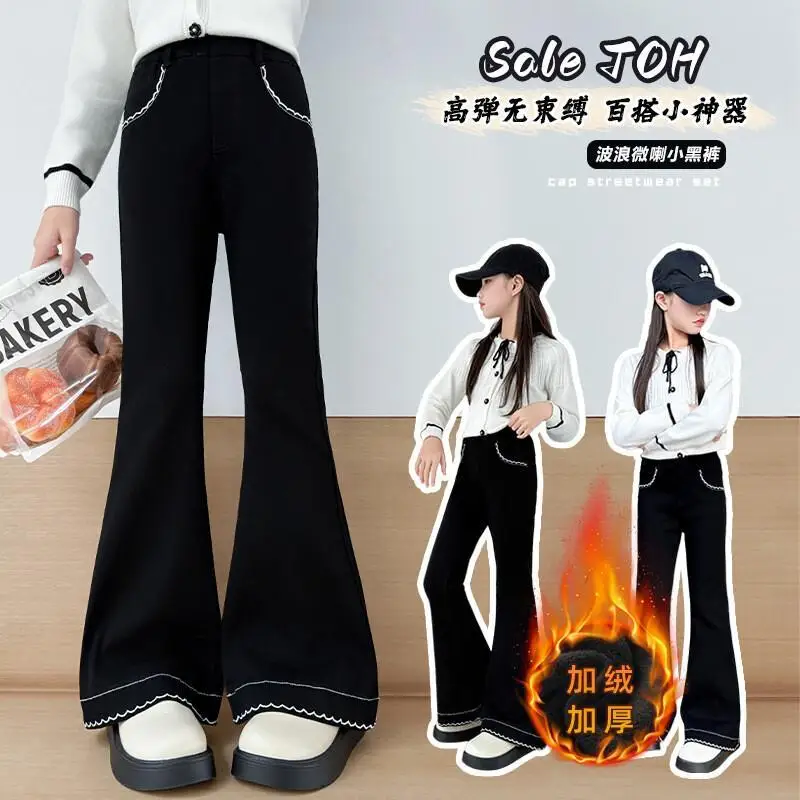 2025 Girls Warm Bell-Bottoms Aurumn Winter Solid Color Lond Pants Elastic Waist Trousers Comfortable Children Clothes 4-12 Years