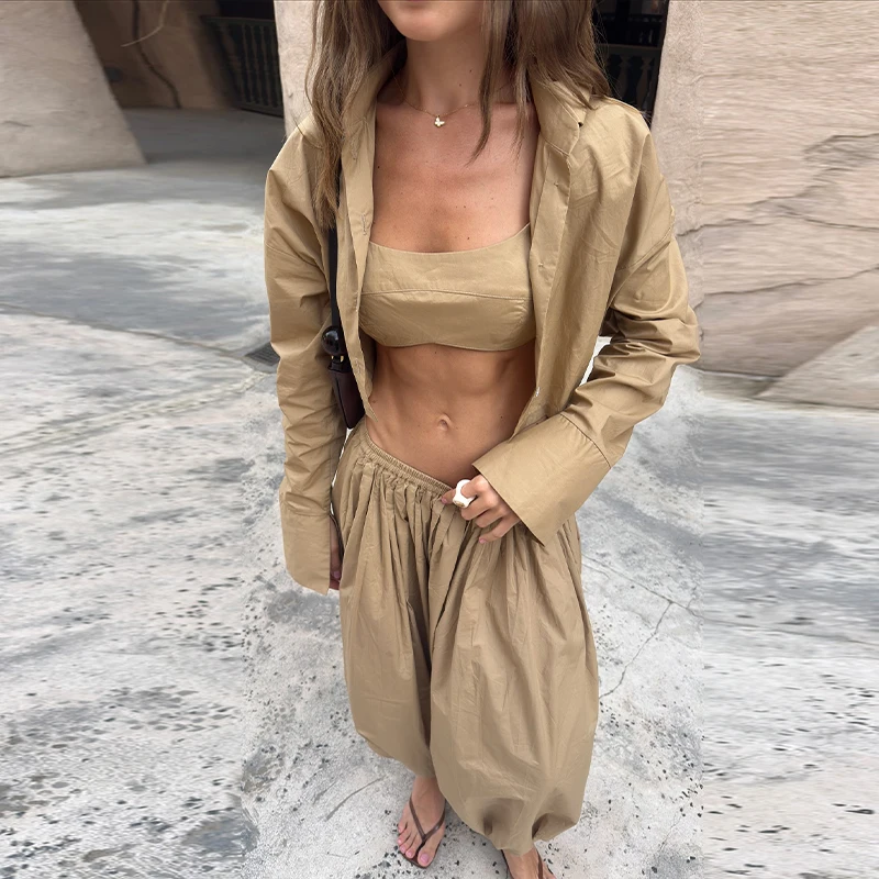 Casual Solid Color Three Piece Long Pant Set Cozy Vest Underwear Wide Leg Lantern Pants Loose Fitting Shirt 2026 Woman Clothing