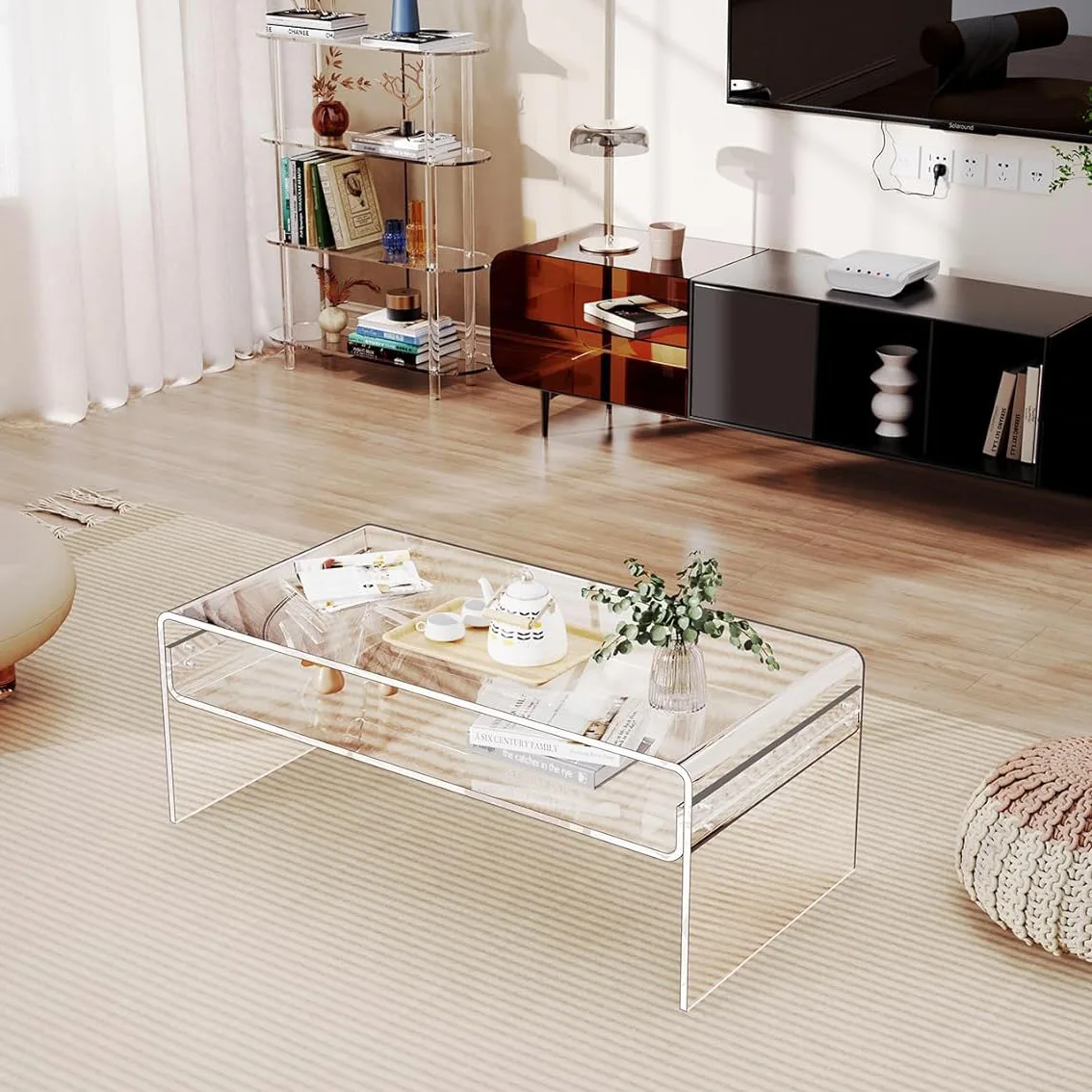 Premium acrylic coffee table, living room transparent coffee table Lucite table with open storage rack