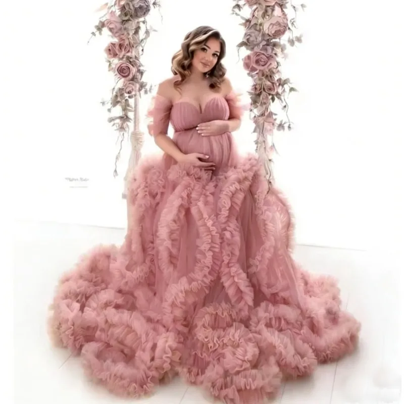 Sexy High Slit Front Maternity Dress - Extra Lush Ruffled Tulle Photography Gown for Pregnancy & Baby shower Occasions