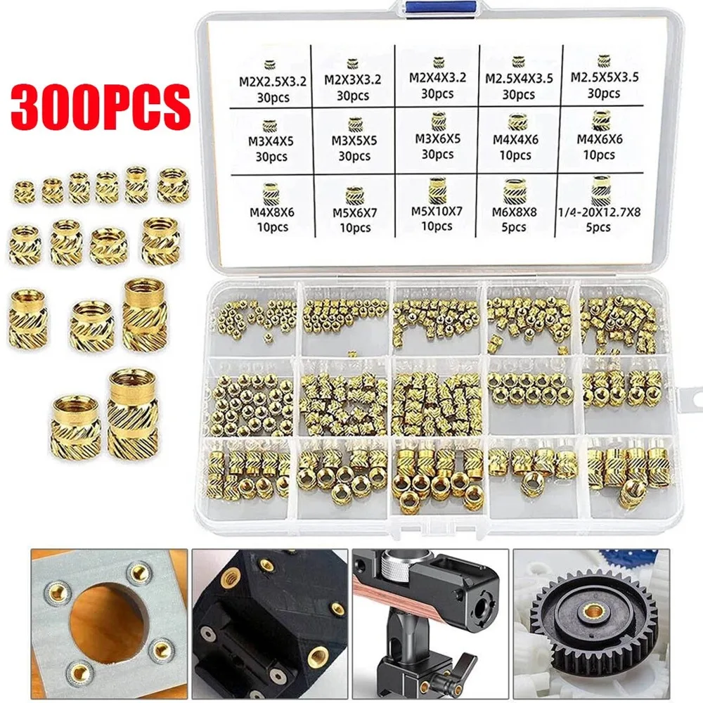 300Pcs Brass Knurled Nut M2 M2.5 M3 M4 M5 M6 1/4-20 Threaded Heat Set Inserts for Plastic 3D Printing Parts Insert Embedment Nut