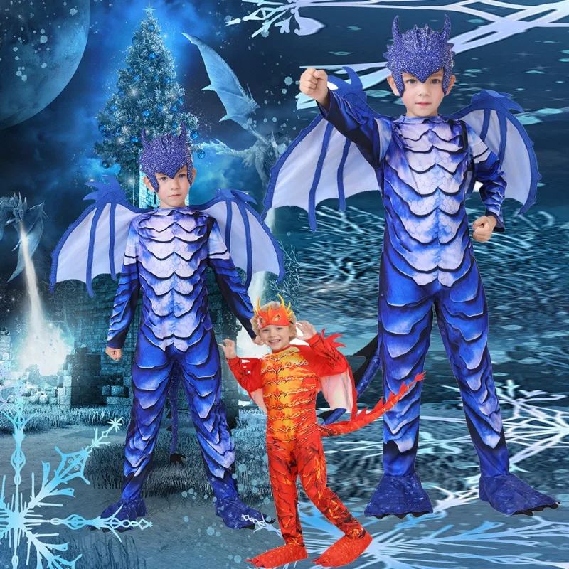 Child Movie D-Dinosaurs The Frost Blue Dragon Knight Jumpsuit for Kids Boys Halloween Carnival Party Costume with Wing Tail Mask