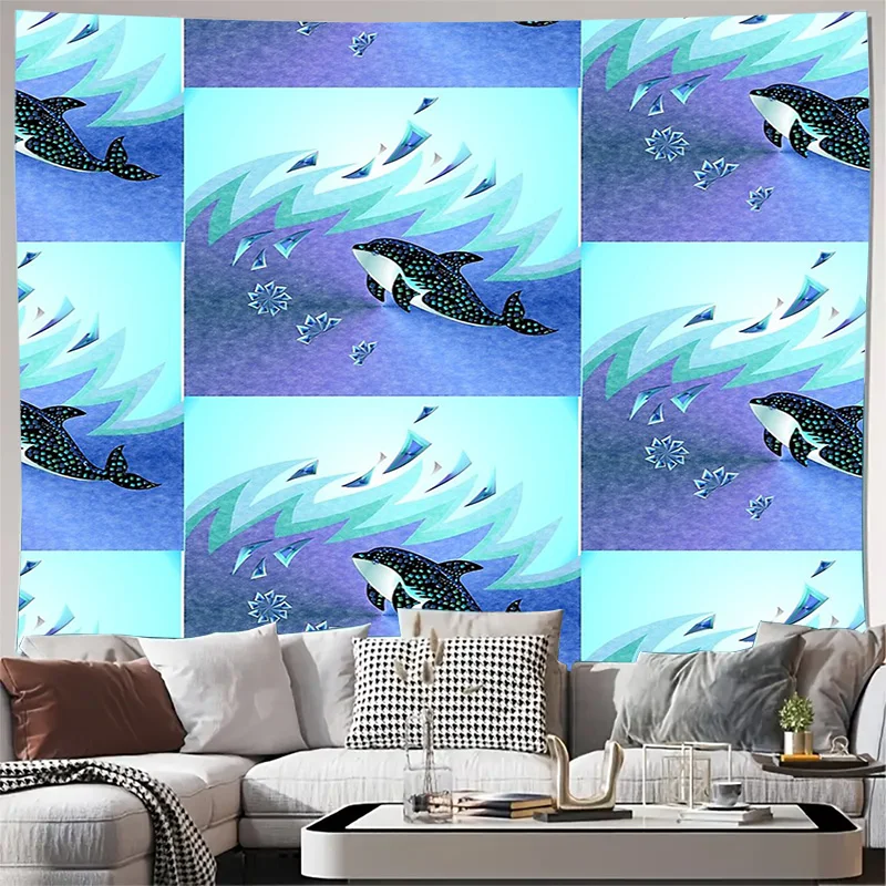 1pc majestic killer whale scene tapestry, Nordic style-vivid underwater cave design with light blue and white shadow decoration