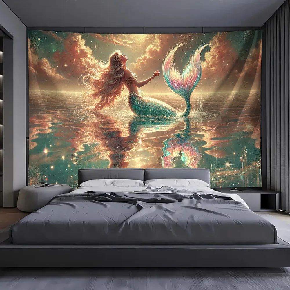 Golden Sunset Mermaid Tapestry - Enchanting Ocean Fantasy Wall Hanging for Dreamy Modern Home Decor
