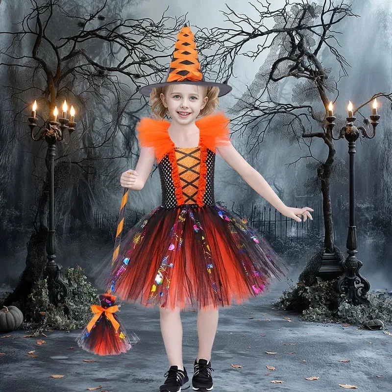 Jogerli Halloween Children's Cosplay Costumes Witch Girl Role-playing Wizard Mesh Princess Holiday Part School Show Cloth Hat