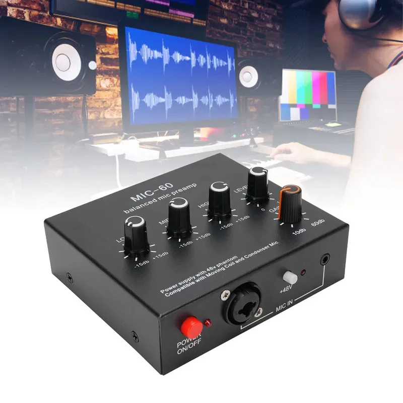 DM1 microphone -28dB preamplifier, plug and play and noise cancelling, for dynamic microphones and 48V phantom power supply