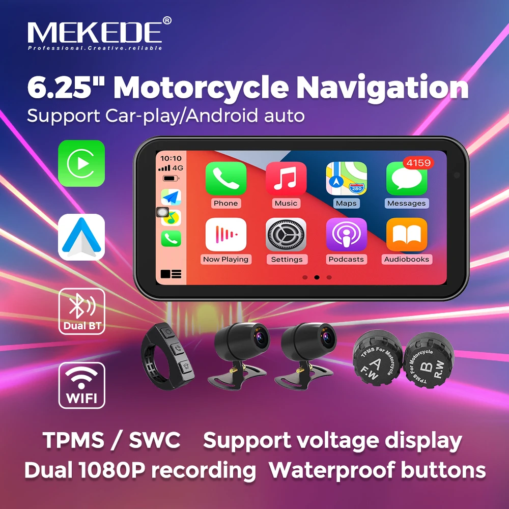MEKEDE 6.25inch Portable Motorcycle Navigation IP67 Waterproof Wireless Carplay Android Auto BT TF DVR Drive Recorder Moto Monit